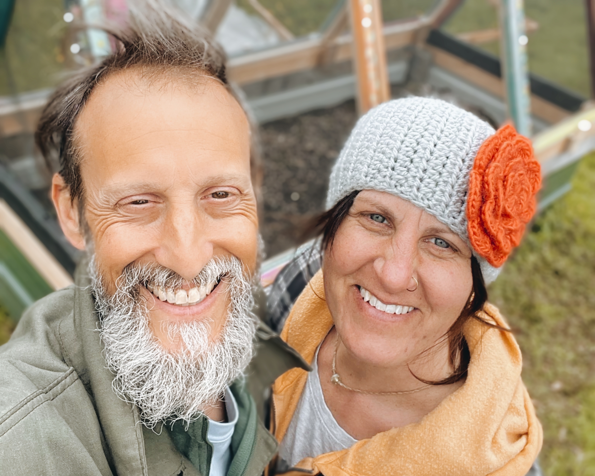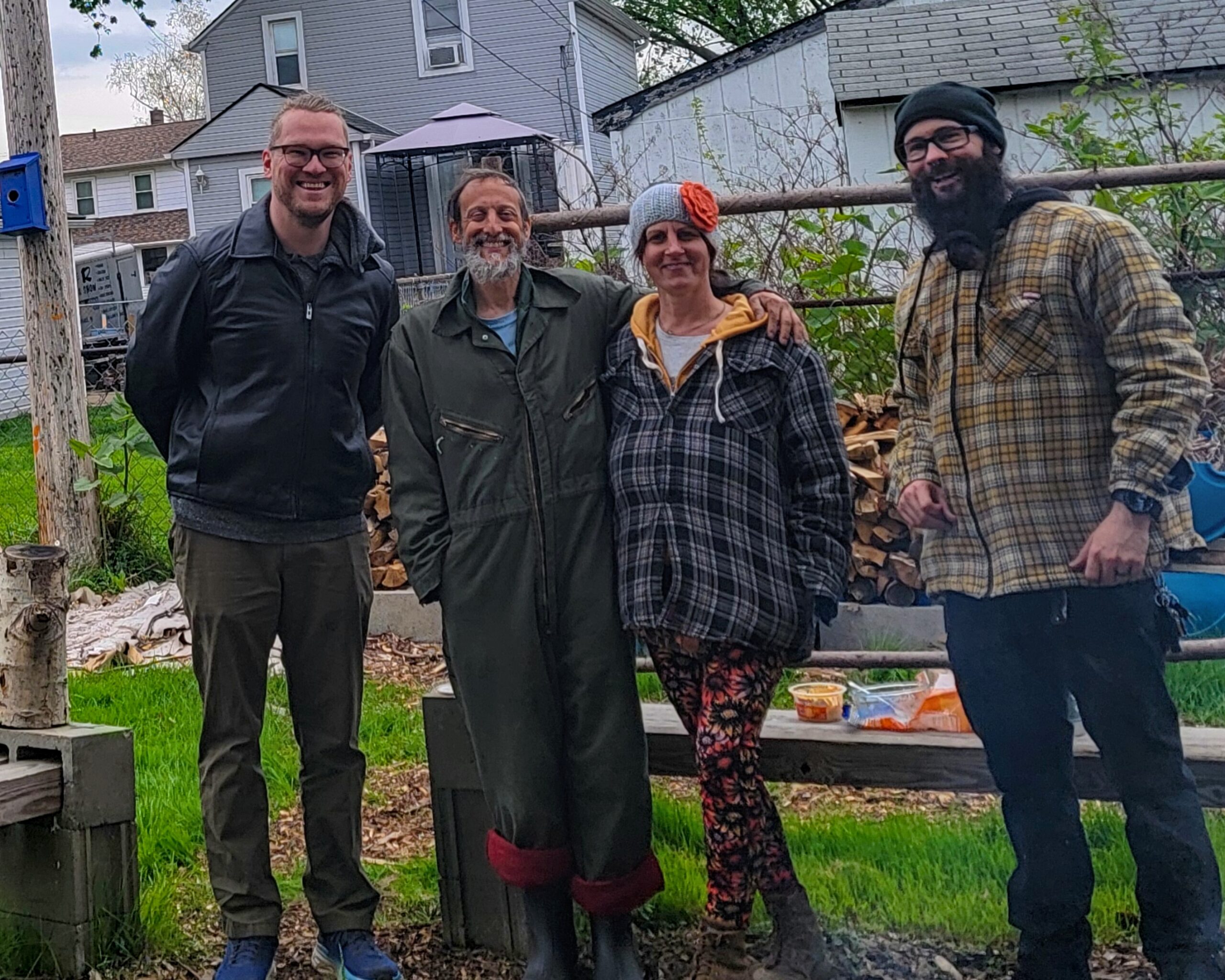 Our garden parties happen every Saturday from 10 AM to 2 PM, and everyone is welcome! No experience needed, no sign-ups required – just show up with whatever energy you have that day. Some folks read books under our shade trees, others dig in the dirt, and some (like Bill and Jen) enjoy lunch by the fire – everyone belongs.