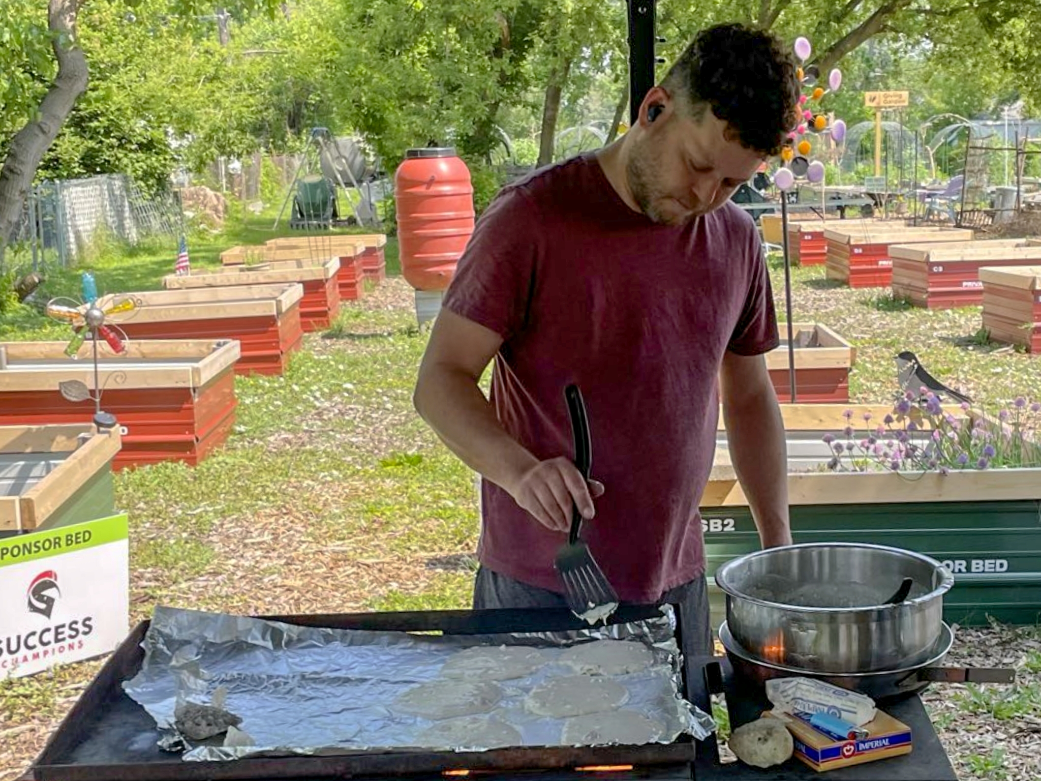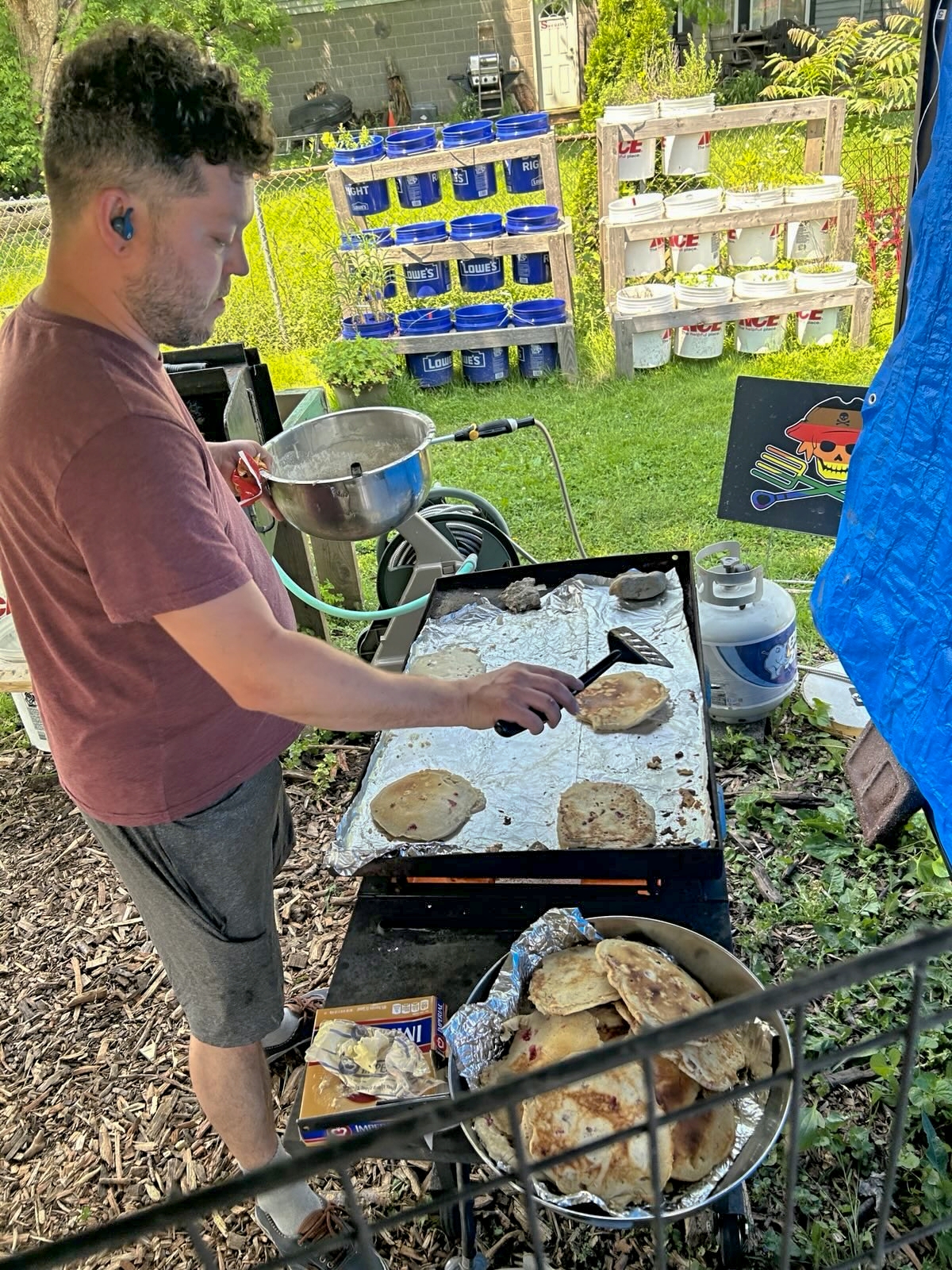 Picture this: Tim rolls up with a flat top grill, decides to DONATE it to the garden, and starts flipping pancakes for everyone. Not just any pancakes – we’re talking chocolate chip AND berry pancakes made with strawberries Katie and the crew had just picked from our own beds.