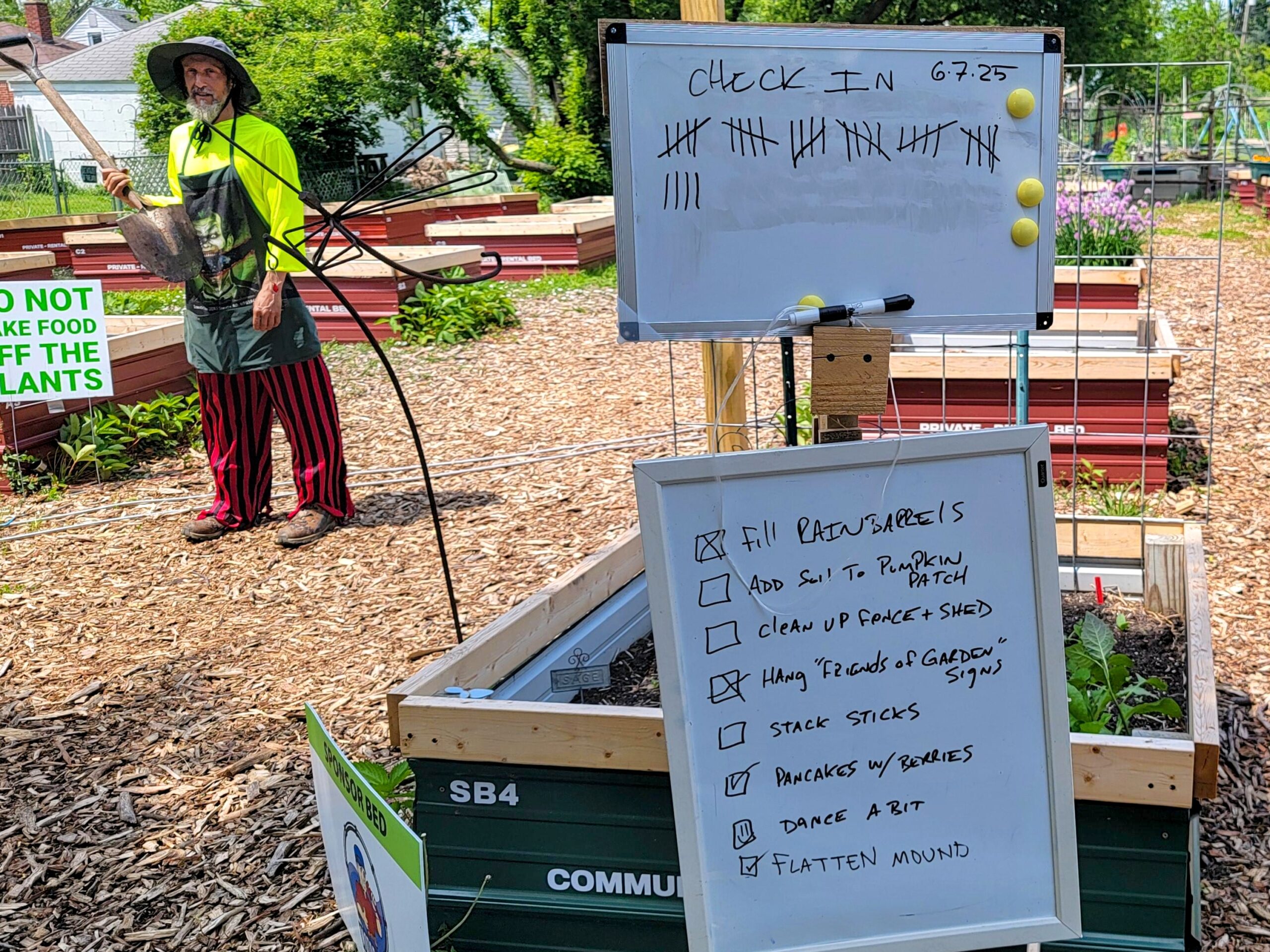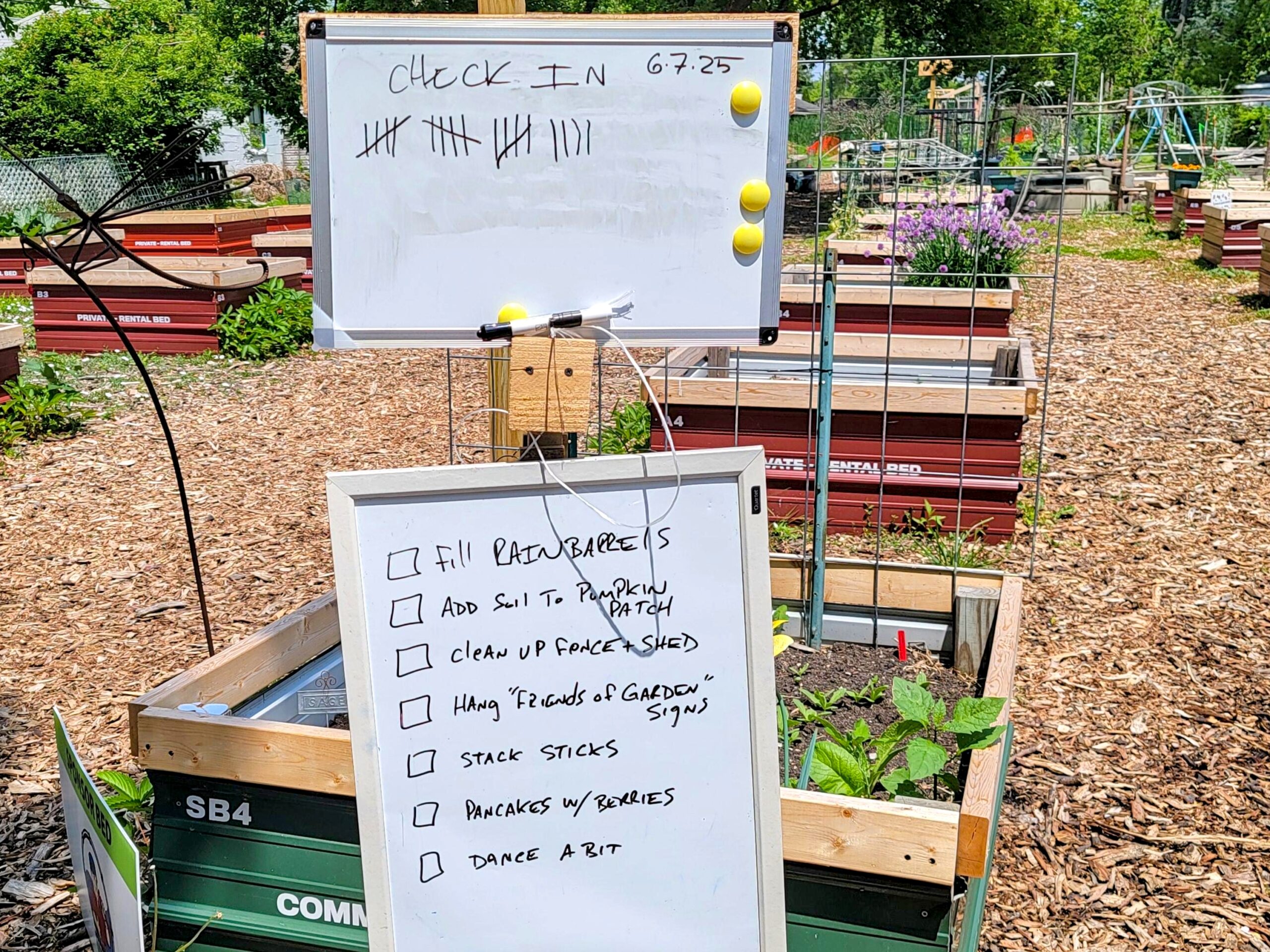 We switched up how we track volunteers – no more formal sign-ins! Now folks just add tally marks to a dry erase board, and right below that, we list the day’s goals. At the bottom of today’s list? “Dance a bit.”