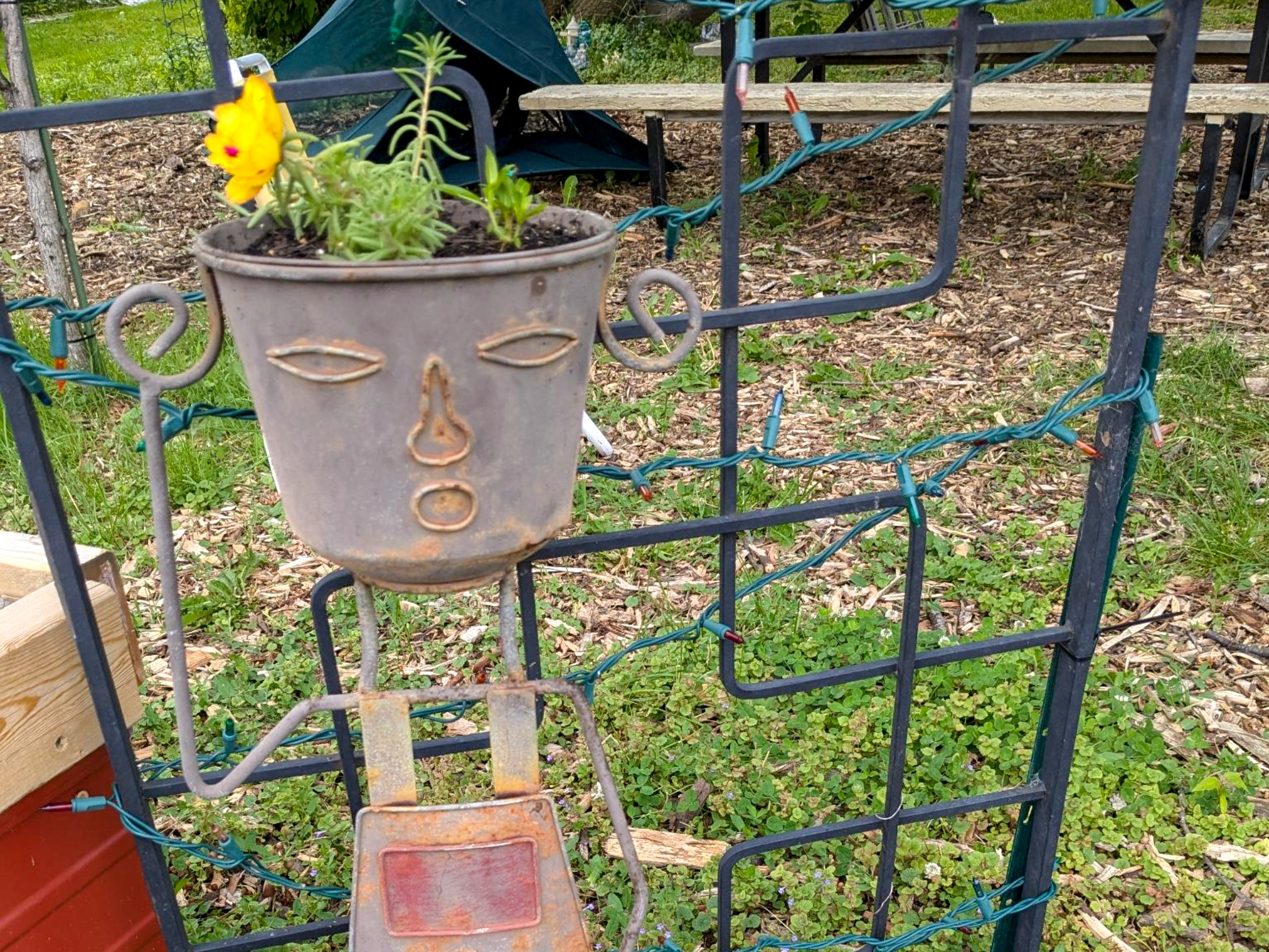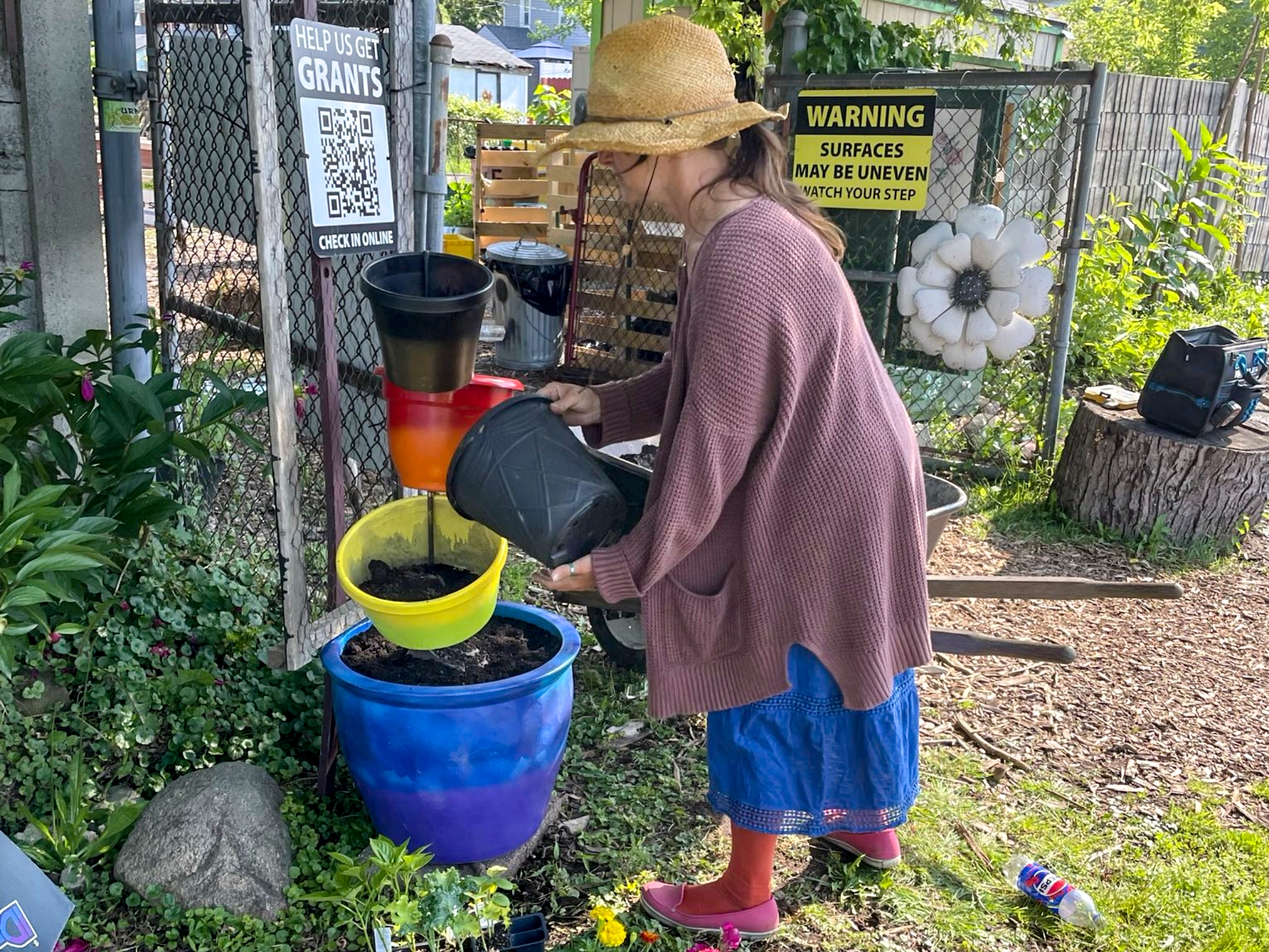 Meanwhile, Jen and her “kickassest accomplice” (that’s our Mohawk Bill for anyone on the outs) were working on a completely different kind of makeover – transforming what she dubbed the “kidnapping of the ECG tipsy planter.” The painted it with gorgeous rainbow colors to match our ECG logo. As she put it, “One of the pots ended up being green and yellow to perfectly represent Urban Seed’s branding as well… Even had left over flowers for some hair for our new friends.”