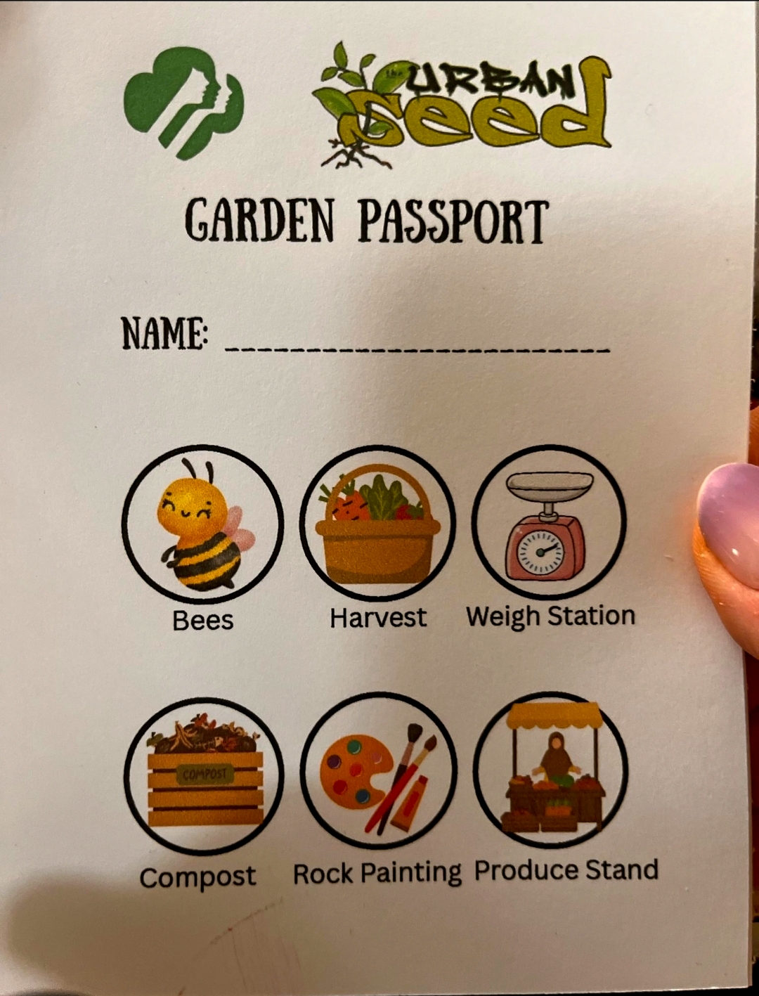 Here’s what made it so cool: instead of just wandering around, Kat and Cola created this brilliant Garden Passport system with six different stations. Each girl got their own passport and collected stamps as they rotated through: