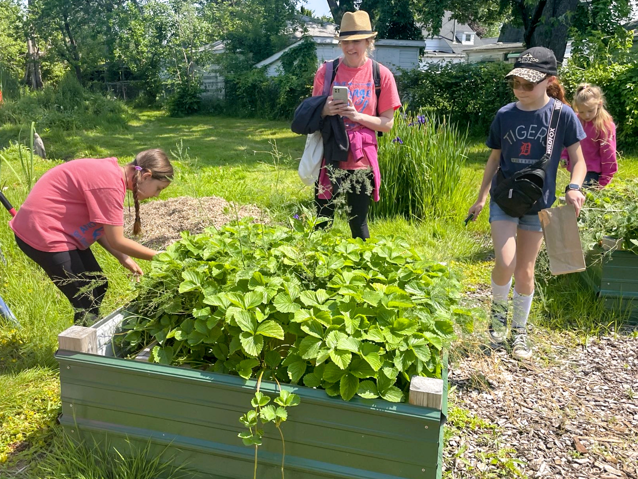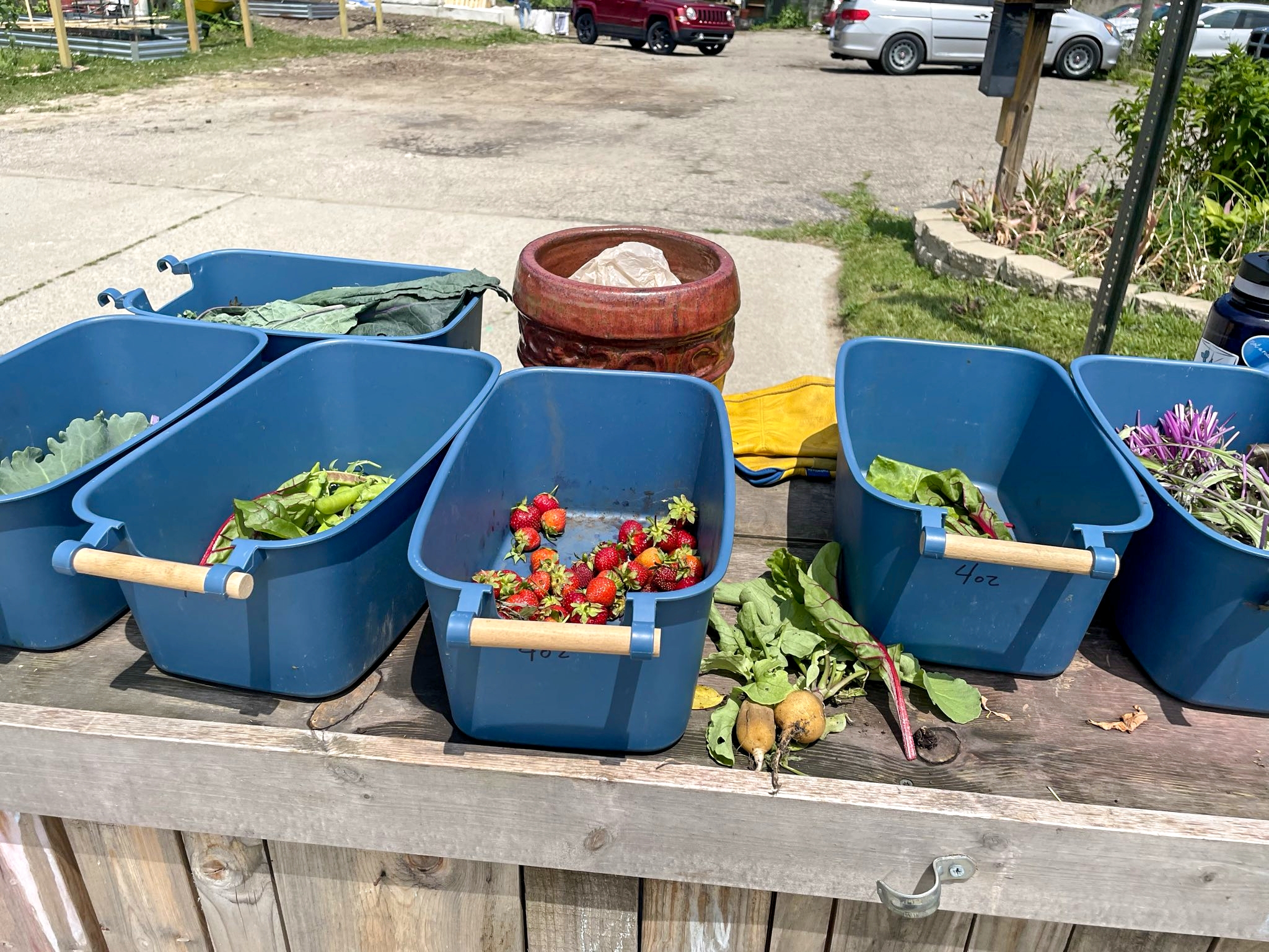 The numbers were incredible: over 18 pounds of fresh produce harvested, including several pounds of strawberries that had everyone’s faces lighting up. Every single bit of it went straight to our free produce stand, which is especially important right now since construction around the garden is making it harder for folks to find us.