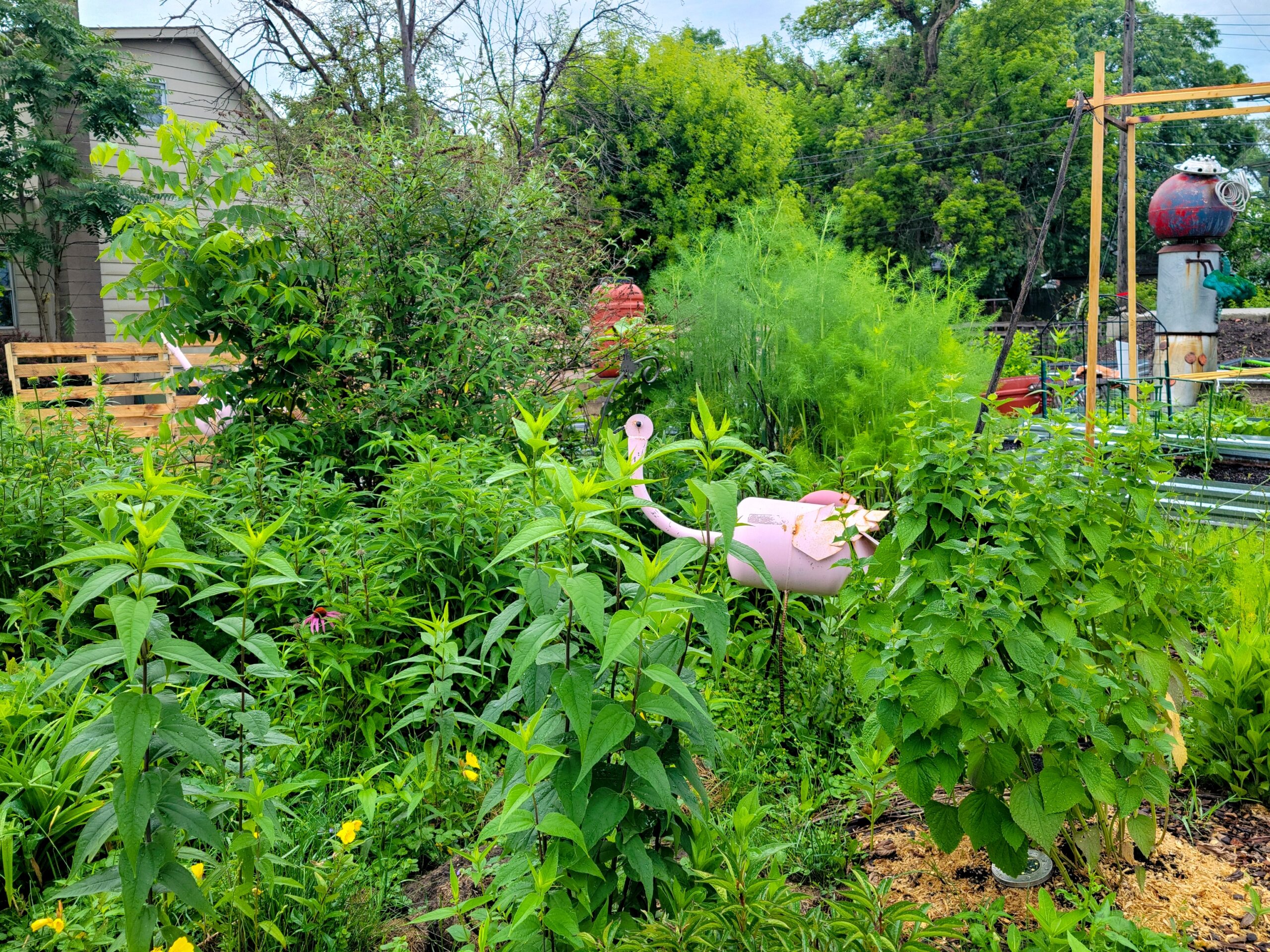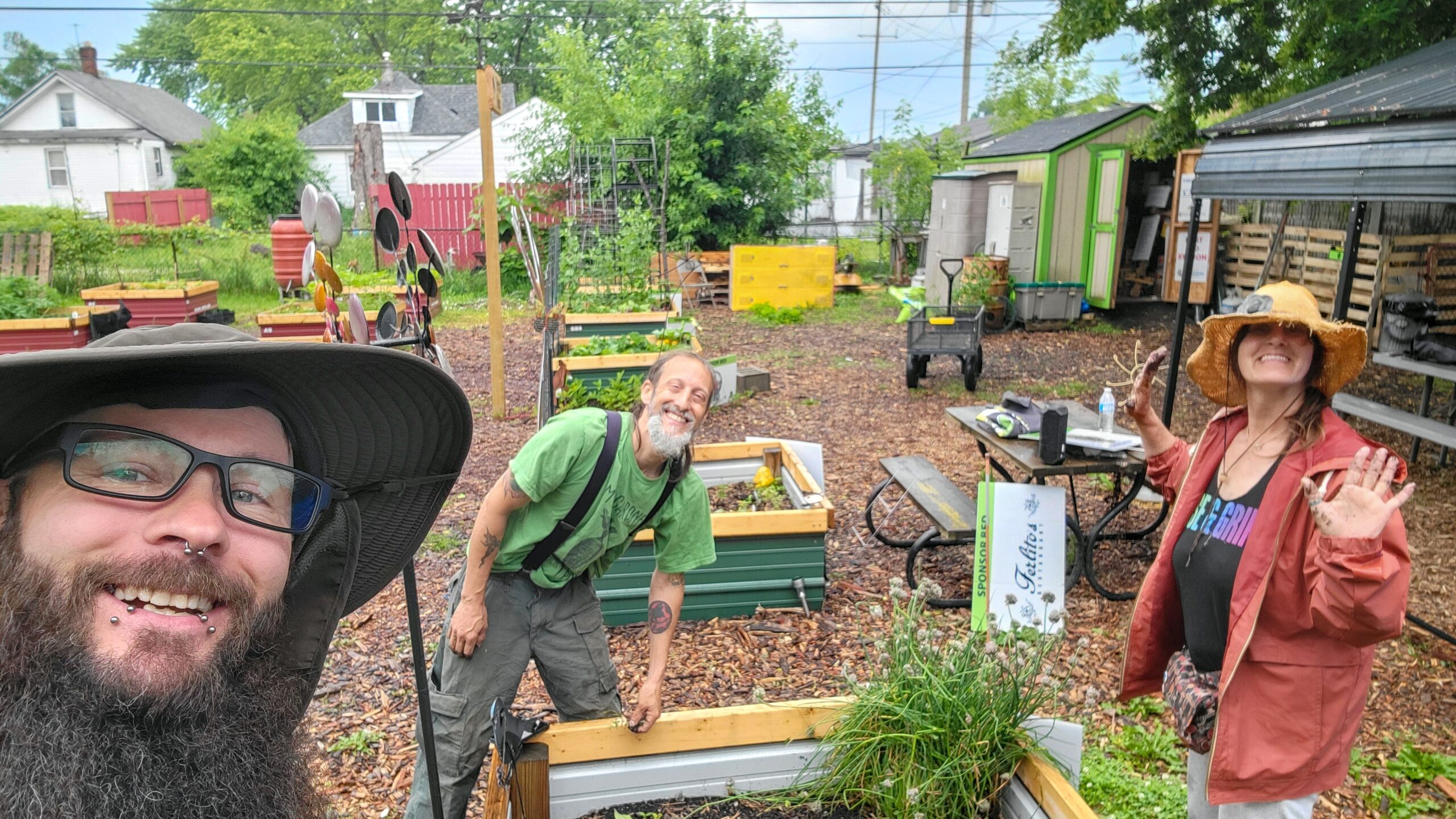 I rolled up to the garden around 10 AM, and Bill and Jen were already deep in the trenches (literally weeding them). These two don’t mess around! Despite the weather trying its best to turn us all into human raisins, we managed to accomplish some pretty incredible stuff.