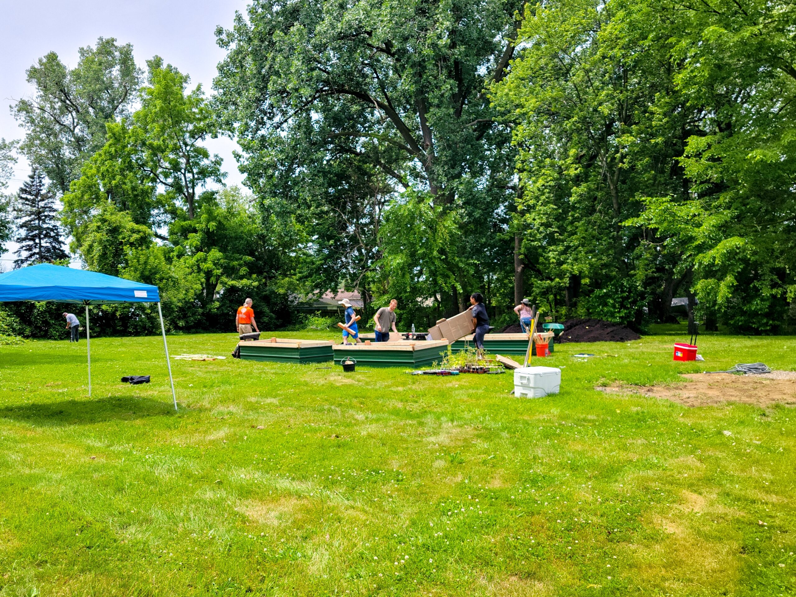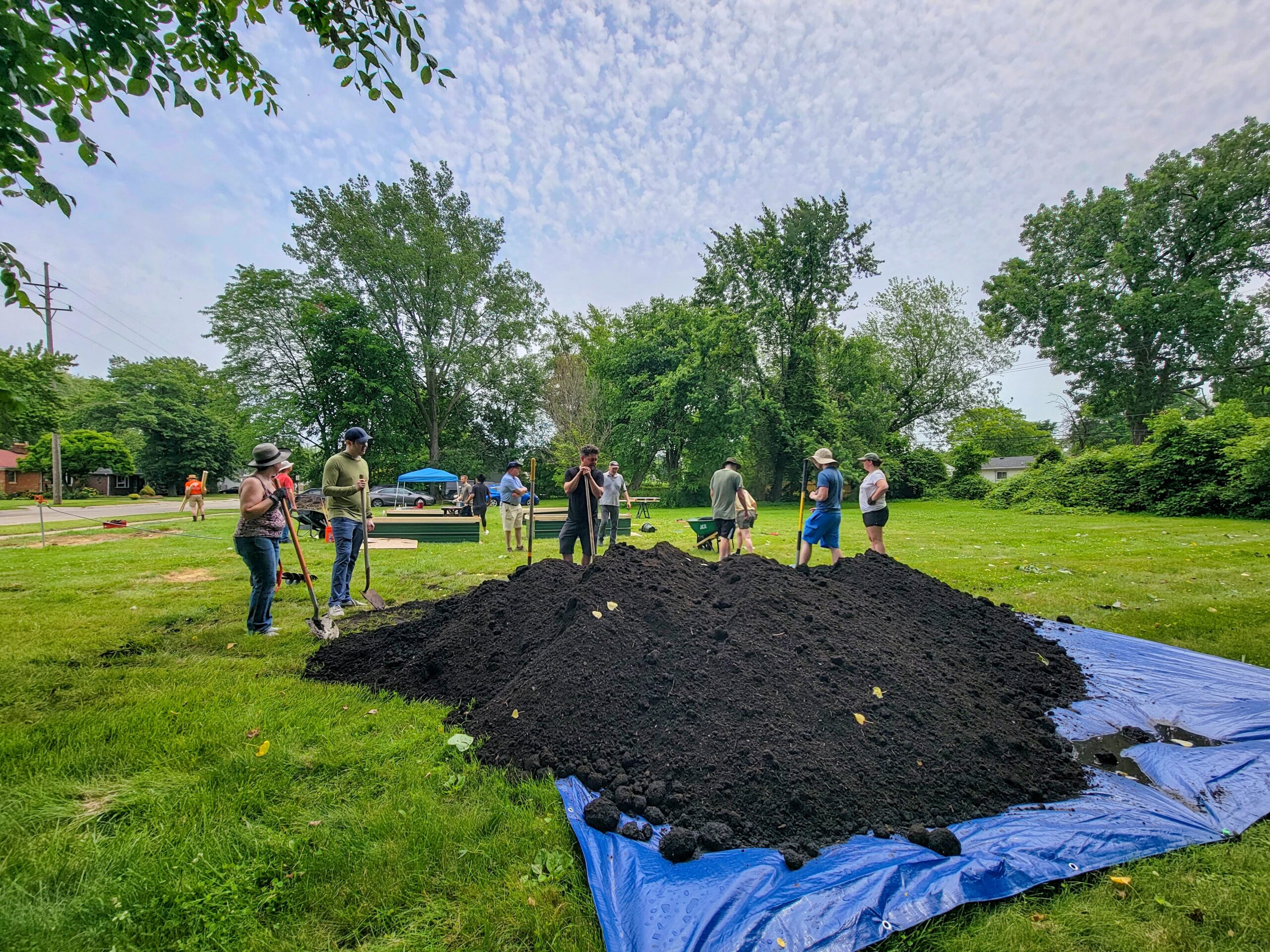 The scene that greeted me was absolutely incredible. People were already there – folks from our Eastpointe Community Garden family alongside brand new faces who’d been following our journey on Facebook. My conservative count hit 16-20 people throughout the day, and let me tell you, every single one of them came ready to work despite that blazing sun.