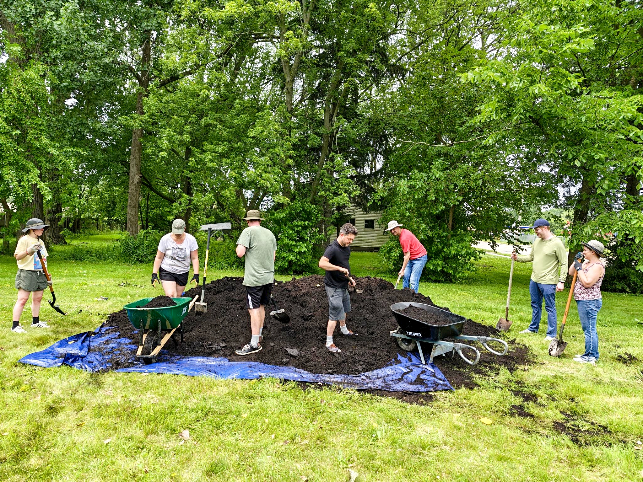 But that’s where this community really shines. Zach painted the perfect picture of how it all unfolded: we started with chatting and socializing until the cardboard arrived, then naturally split into different roles. Some folks grabbed rakes, others picked up shovels, and everyone just found their groove transporting materials around.