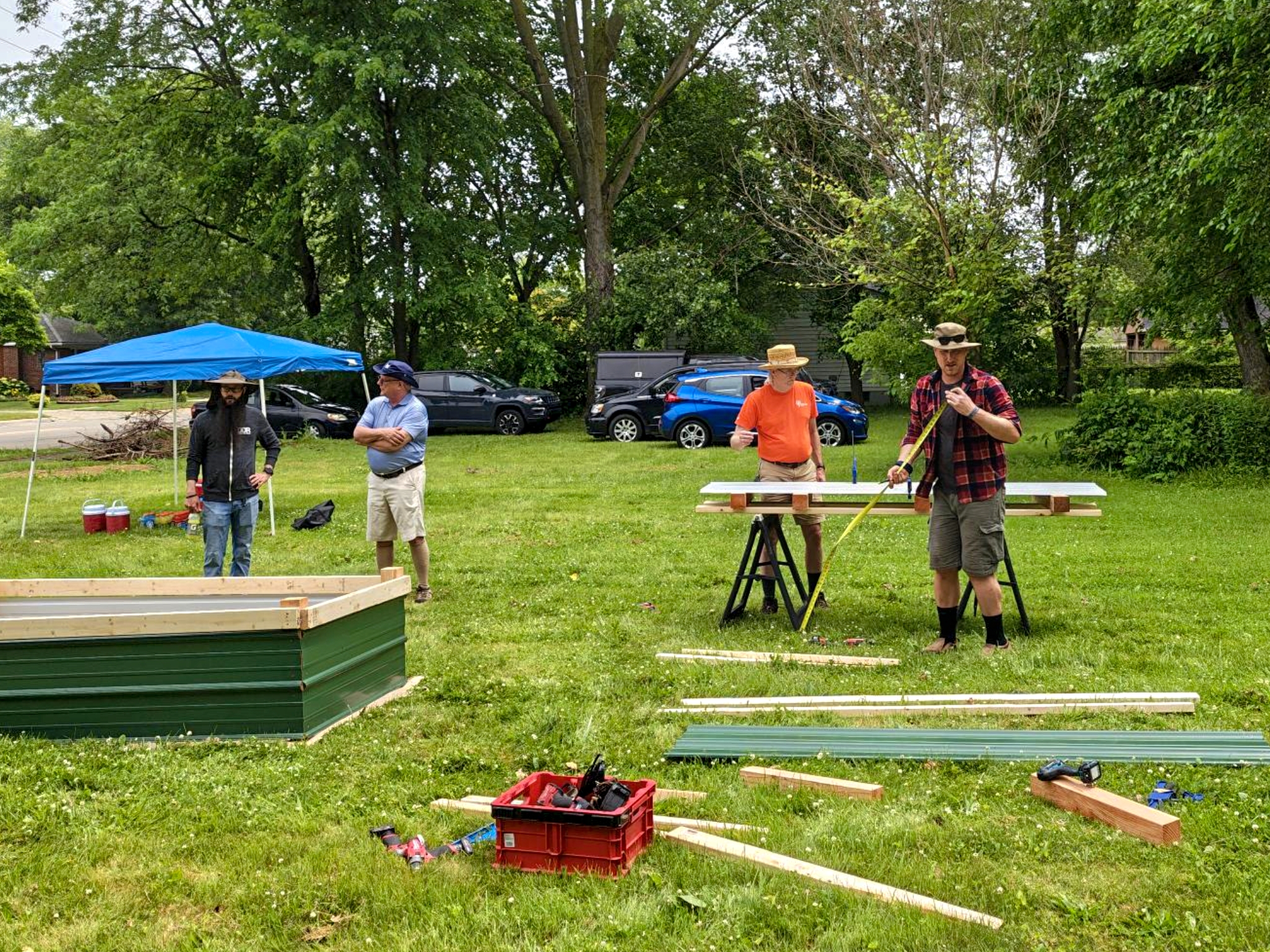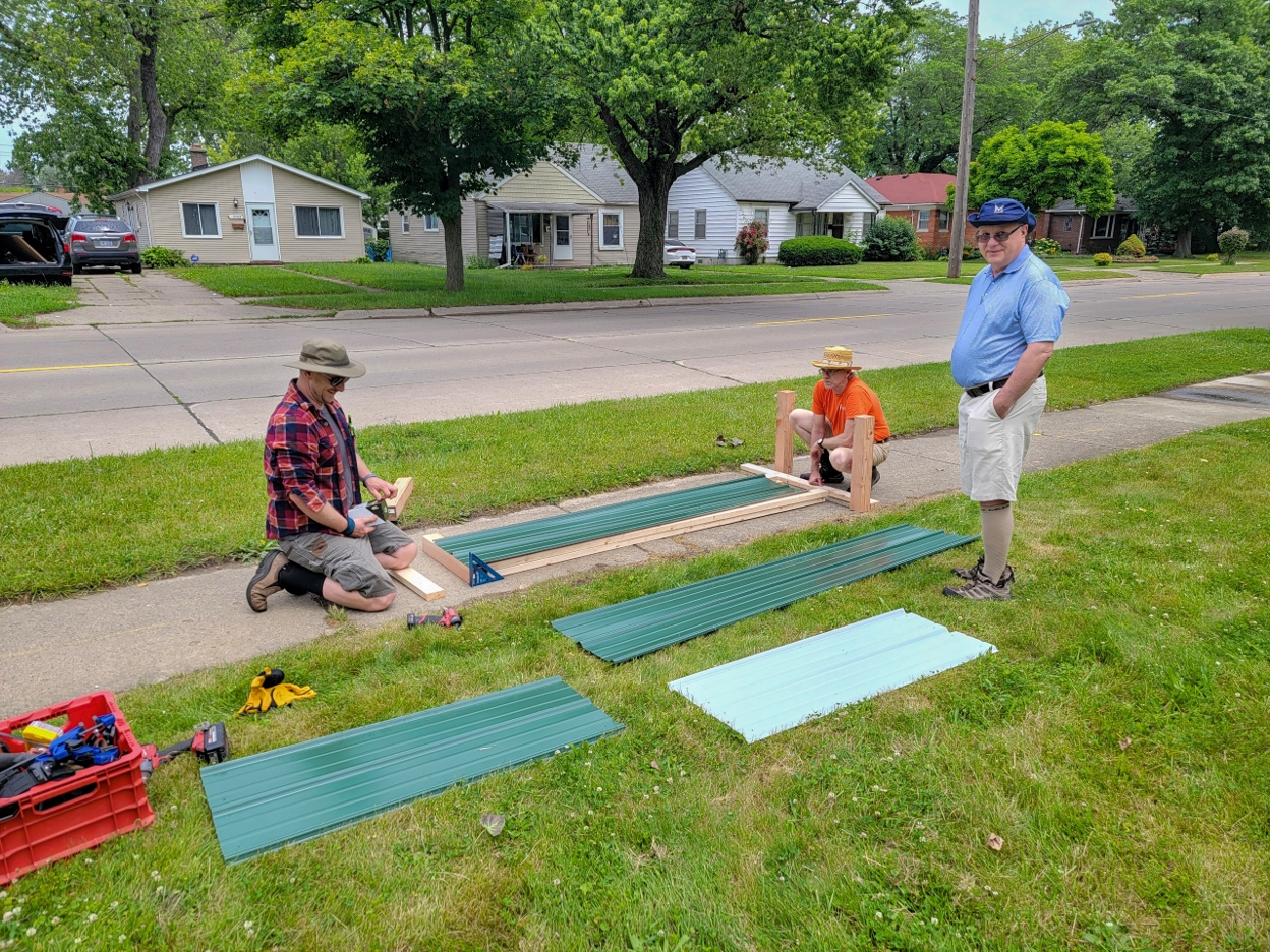 Meanwhile, Jeff was in full technical mode – pre-drilling holes in sheet metal sidewalls, cutting panels in half for bed ends (with Hal and Pete acting as his trusty assistants), then assembling everything right there on the sidewalk. Pete was the compost king, filling wheelbarrows and doing that detailed leveling work that makes all the difference. The man knows his soil science!