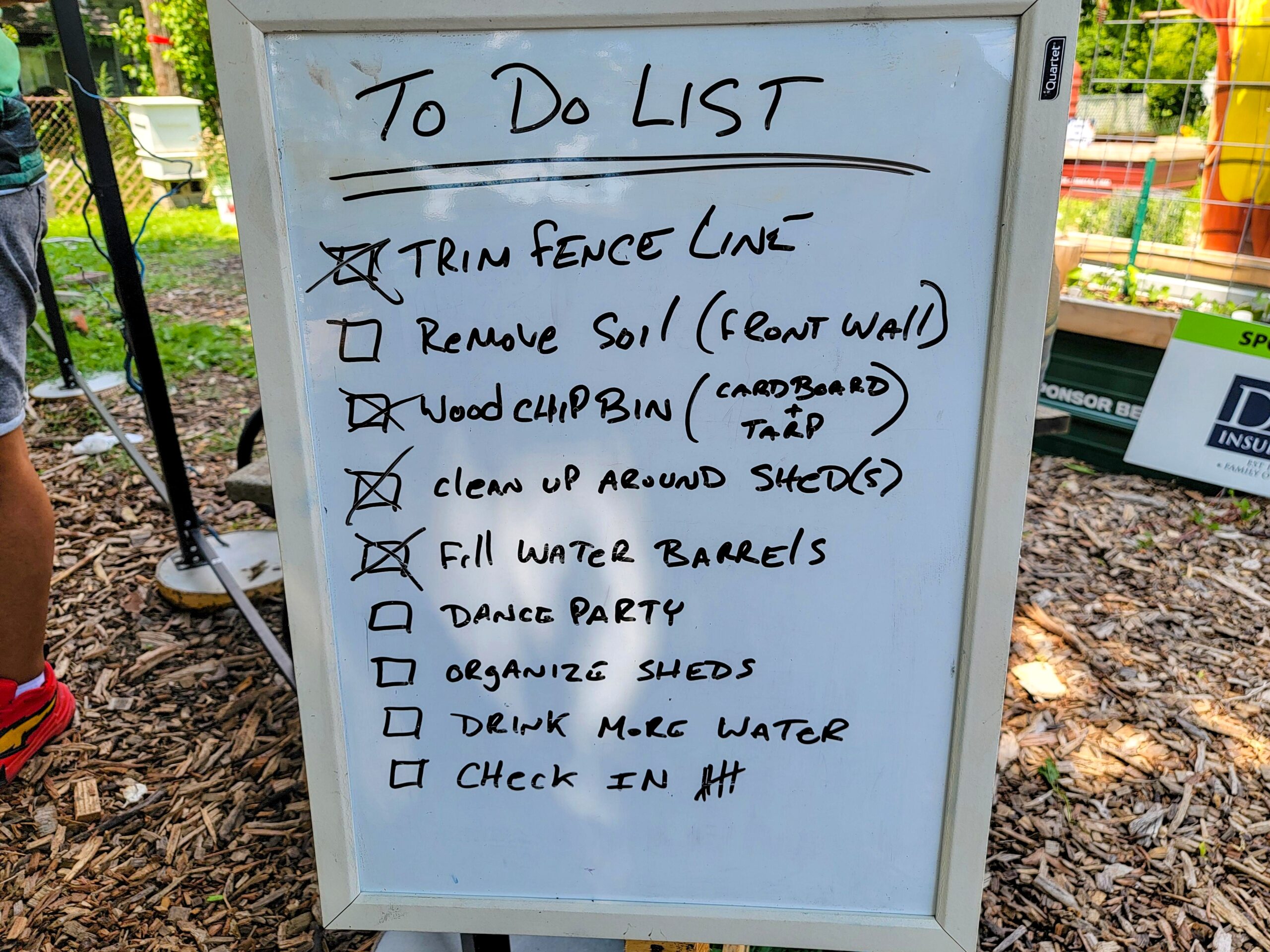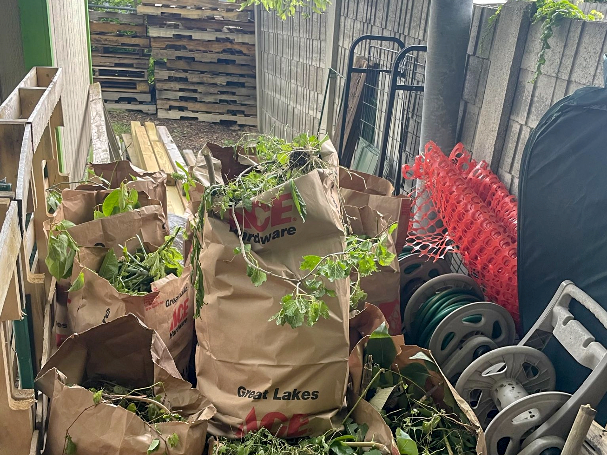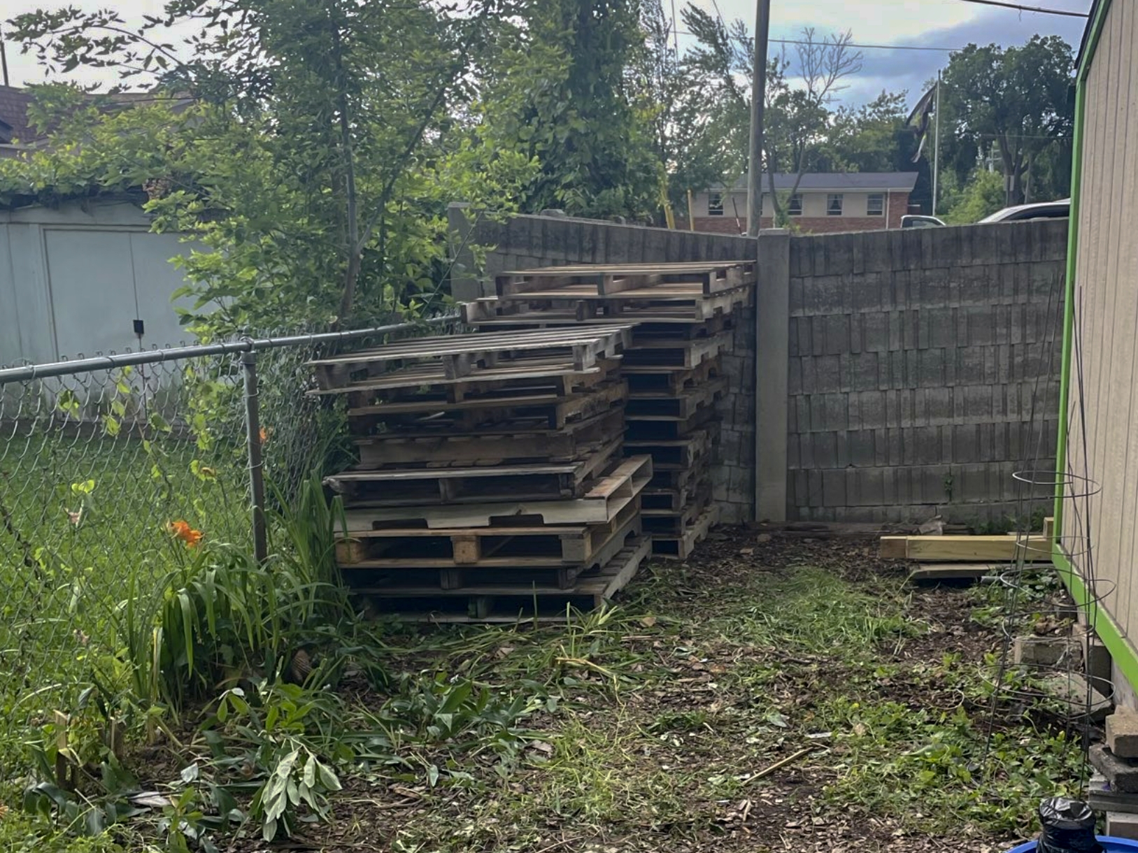 Shout out to Pastor Kevin and the dozen volunteers from Love Life Church who showed up early and absolutely crushed it with their annual volunteer day. These folks are the real deal – they tackled over 100 feet of fence line cleanup, reorganized our entire pallet storage area behind the shed, cleared out the garbage corral so we could refill it with yard waste bags, pulled bindweed from 5 different rental beds, and even set up our new wood chip holding bin with cardboard and a tarp so our next delivery doesn’t get mixed up with the soil.