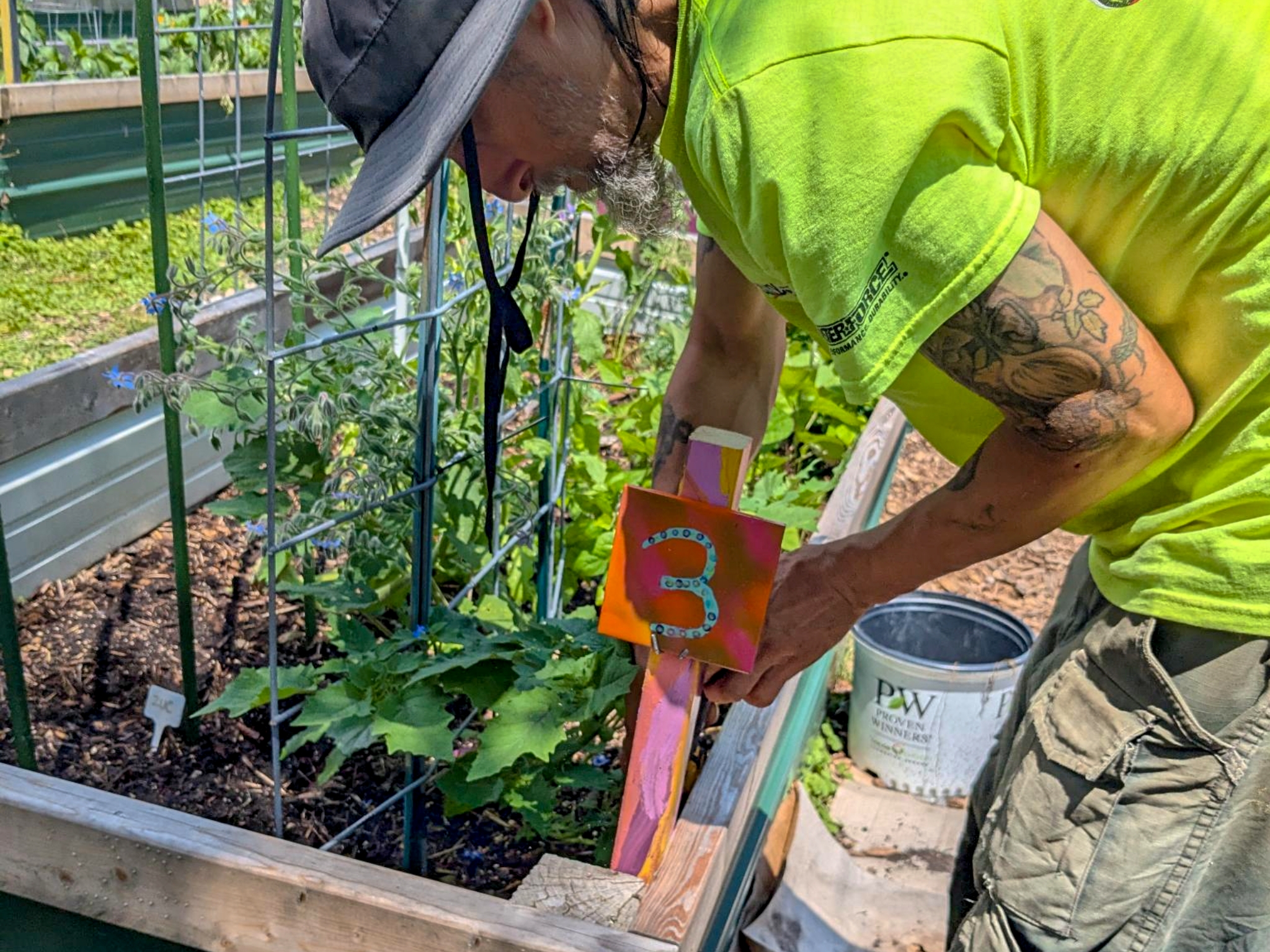 - Bill and Jen were the early birds, arriving at 8:15 AM to start harvesting in the giving garden. These two are absolute legends – they also helped re-string tomatoes and attached those hand-painted bed numbers we’ve been working on (until the storm cut that project short).