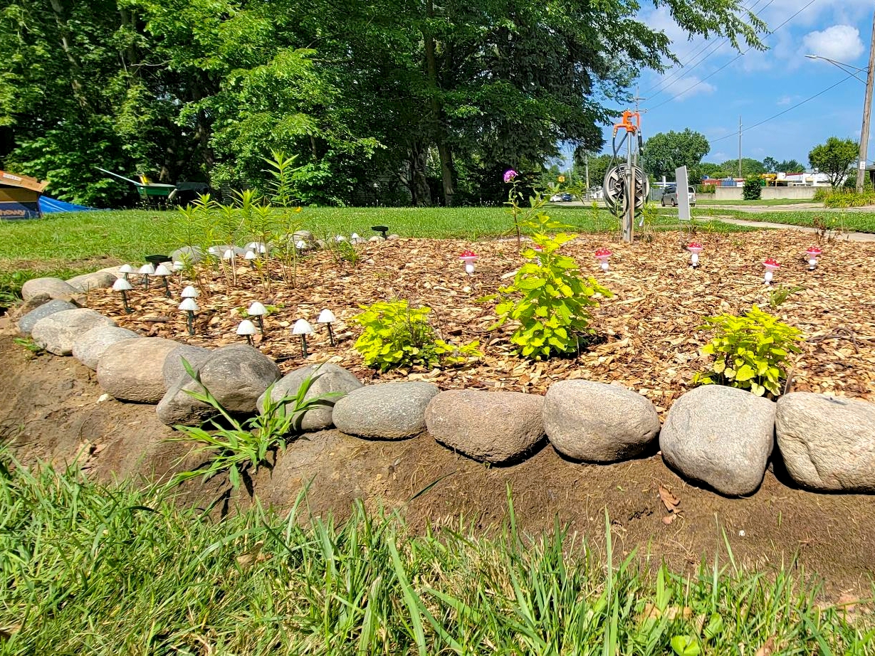 When we arrived, the garden was buzzing with activity! Kat and Cola were putting the finishing touches on some gorgeous solar-powered mushroom lights in the native garden – these babies are going to add such a magical glow to the space come evening. Meanwhile, Nico was already deep into lawn care mode, making everything look pristine.