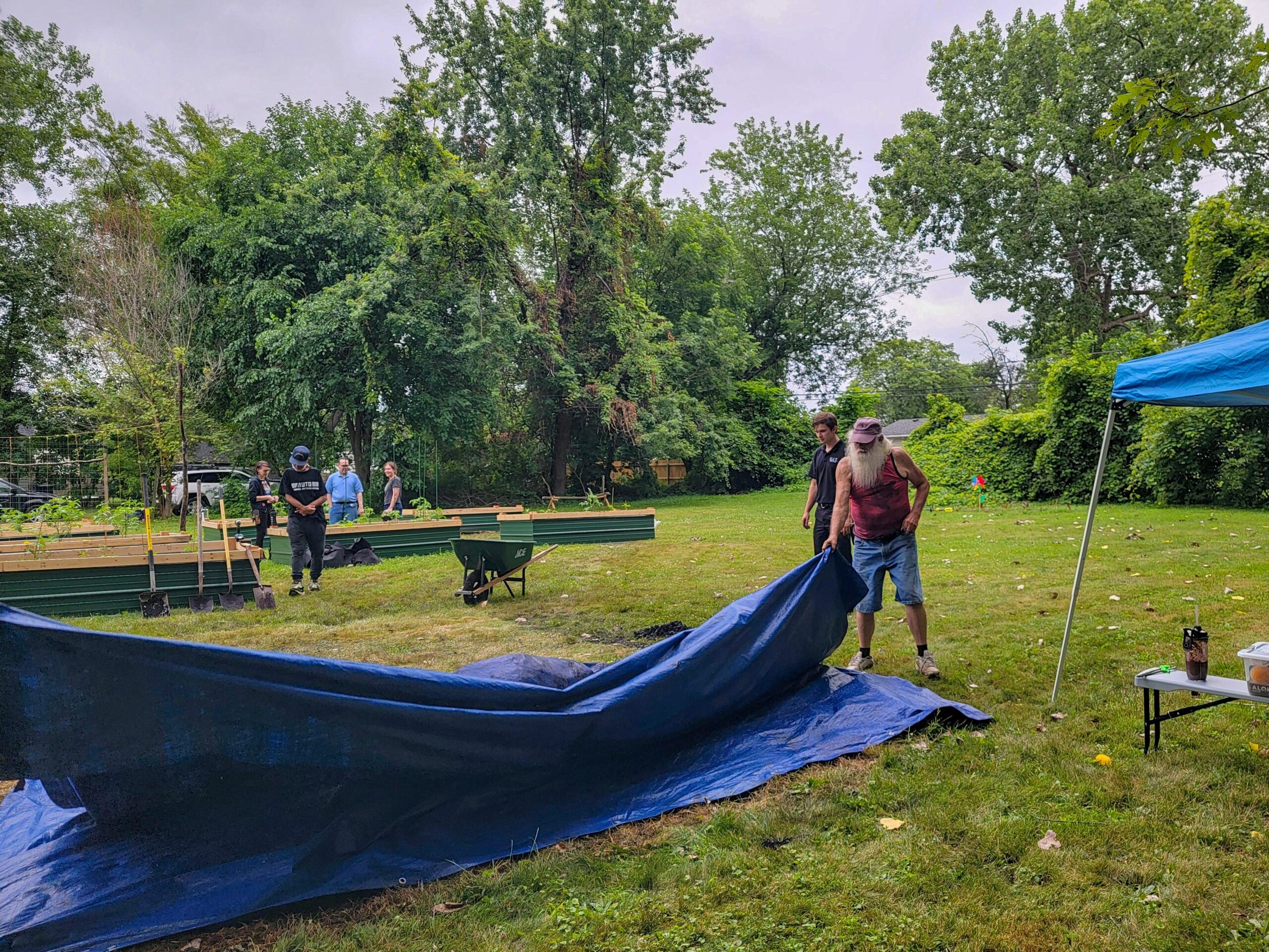 By the time Shay and I rolled up at 11 (after grabbing supplies from our Eastpointe garden family), the rain had packed up and left. The temp was sitting pretty at 70 degrees – not too hot, not too cold – just perfect for getting our hands dirty. I threw up our trusty pop-up tent just in case Mother Nature had any more surprises, grabbed a cooler full of ice, and got ready for what became our most incredible garden party yet.