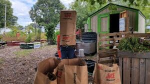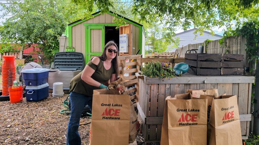 Melanie was an absolute lifesaver today, spending her time rebagging all our yard waste. Her husband Steve swung by, and together they loaded everything into their vehicle to take to their house since their garbage day is Monday. I got a hilarious photo of Melanie with most of her body inside a lawn bag – the dedication of our volunteers never ceases to amaze me!