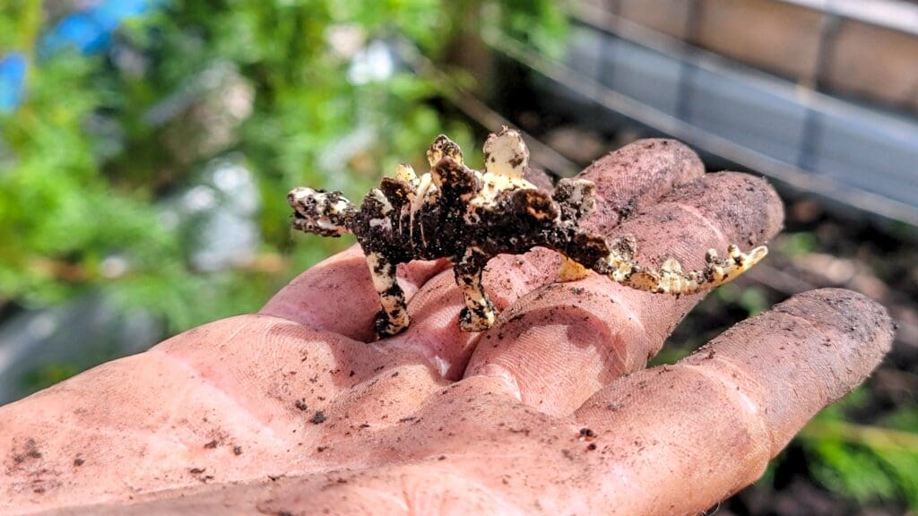 Now, before you get too excited, we’re talking about the tiny plastic variety. Someone has been secretly planting little dinosaur remains throughout our garden beds, and kids (and apparently adults!) find them while they’re working. Watching Jen’s face light up when she unearthed her prehistoric friend was priceless – proof that you’re never too old for a good garden surprise!