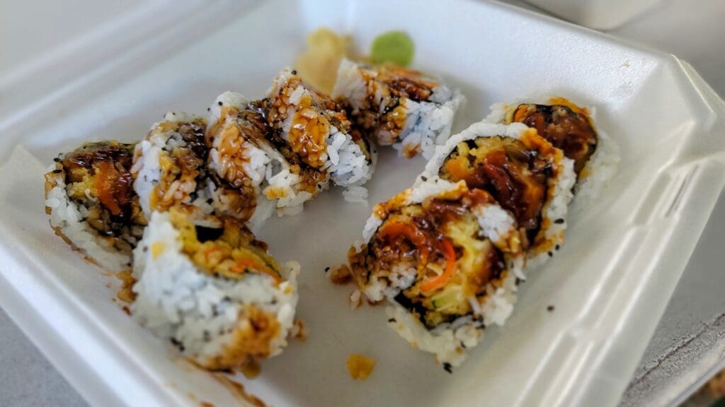 Here’s where the day took an unexpectedly delicious turn. Stephanie was stuck at work and couldn’t make it to the garden, but during her lunch break, she went above and beyond. She stopped by Sushi Zone on 9 Mile (one of our awesome neighbors down the street) and grabbed sushi for the entire volunteer crew!