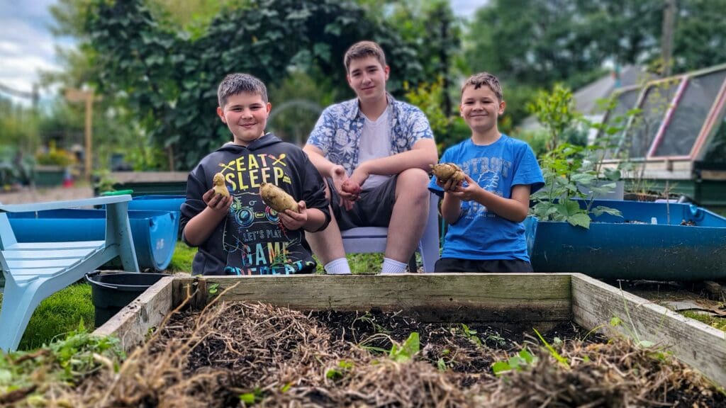 The Pickle Boys from South Warren made their very first visit to our Eastpointe location! Their mom Cat brought them by, and they dove right in, helping us harvest beans and potatoes. I managed to snag a great photo of them working alongside Glen during the potato dig – there’s something special about watching different generations work the soil together.
