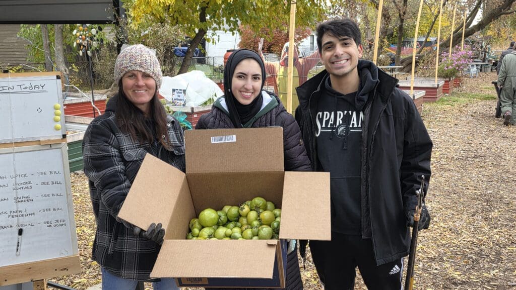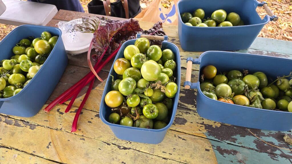 They tackled around 10 of the rental beds – pulling out old plants, cleaning up the soil, getting everything ready for winter. Then they moved on to the Giving Garden and cleaned out another 7 or 8 beds there. But here’s what really impressed me: they were careful. They didn’t just yank everything out and toss it. When they found green tomatoes, they set them aside gently so we could ripen them later and still get them to people who need fresh food.