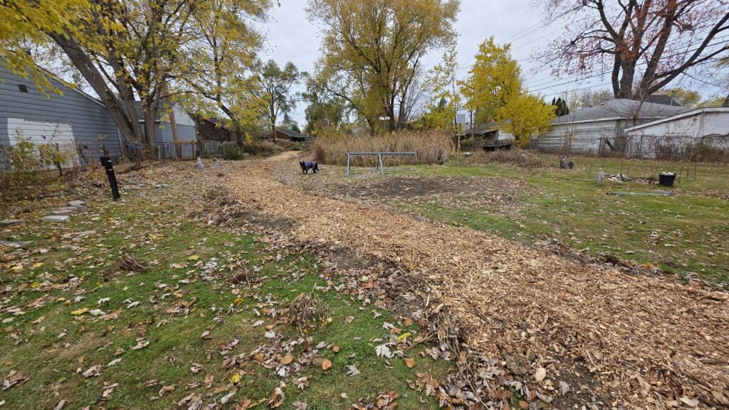 We’re laying down a wood chip trail back there. It doesn’t look like much now – just chips on dirt – but in March when everything’s thawing and soggy? We’re going to be so glad we did this. Future Us is going to walk back there on dry ground and think “thank you, November Us, for having the foresight.”