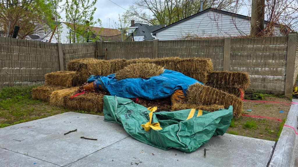 First order of business: the pile of straw bales sitting out in the front parking lot. They needed to be moved. They were also completely soaked. If you’ve never picked up a waterlogged straw bale, I envy you. Bill jumped in and we hauled them to a better spot where they can actually earn their keep this season. Nobody asked. Somebody just grabbed the other end. That’s ECG.