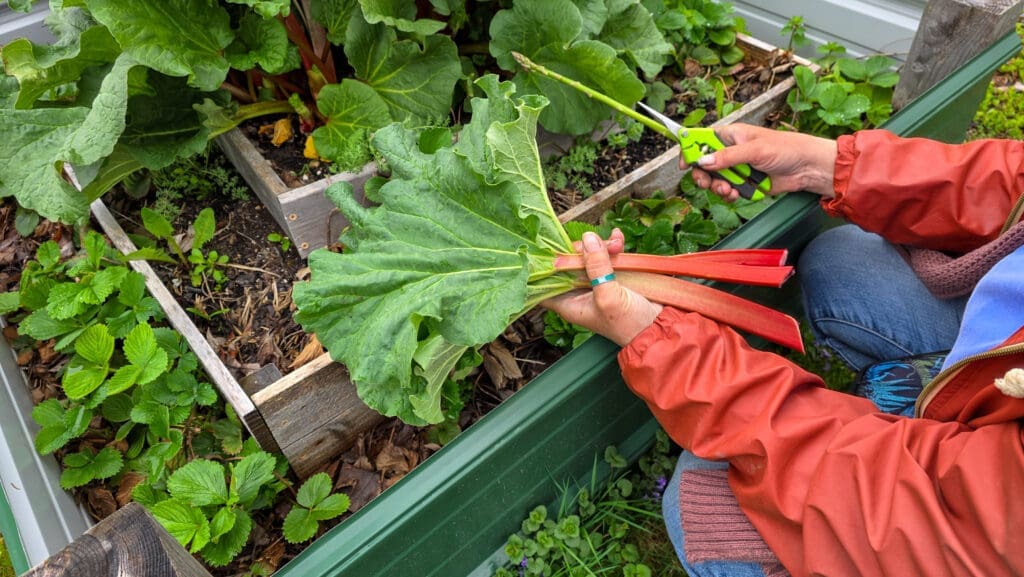 1 pound, 2 ounces of rhubarb came off the bed up front – that beautiful red and green that tells you the season is officially underway. And our first asparagus spears have started poking up out of the ground, which I will never, ever get tired of seeing no matter how many years we do this.