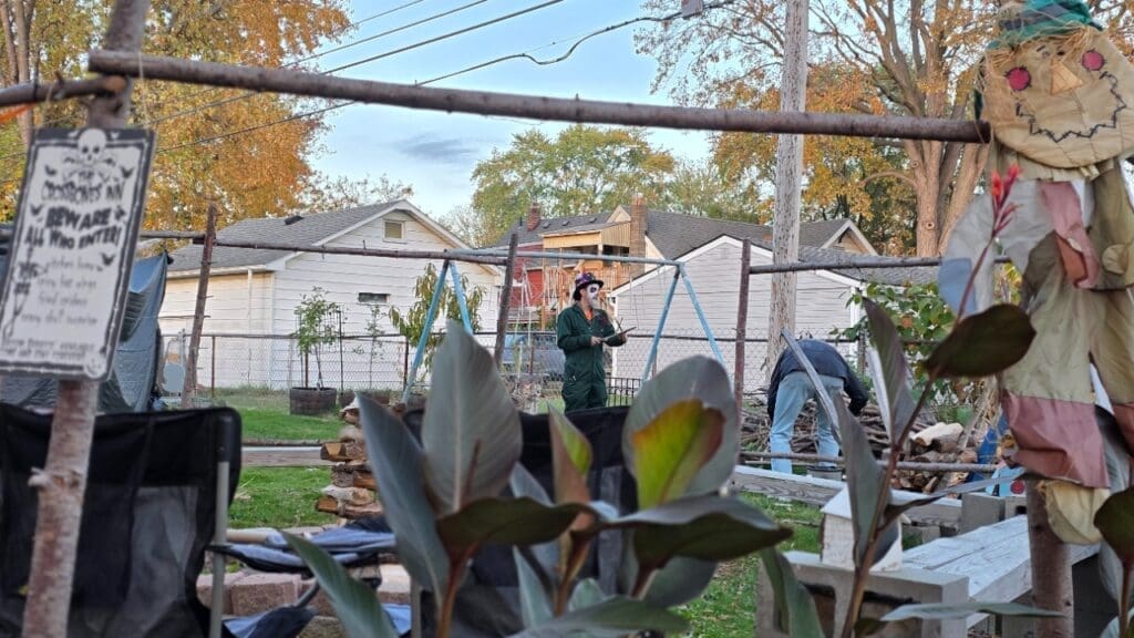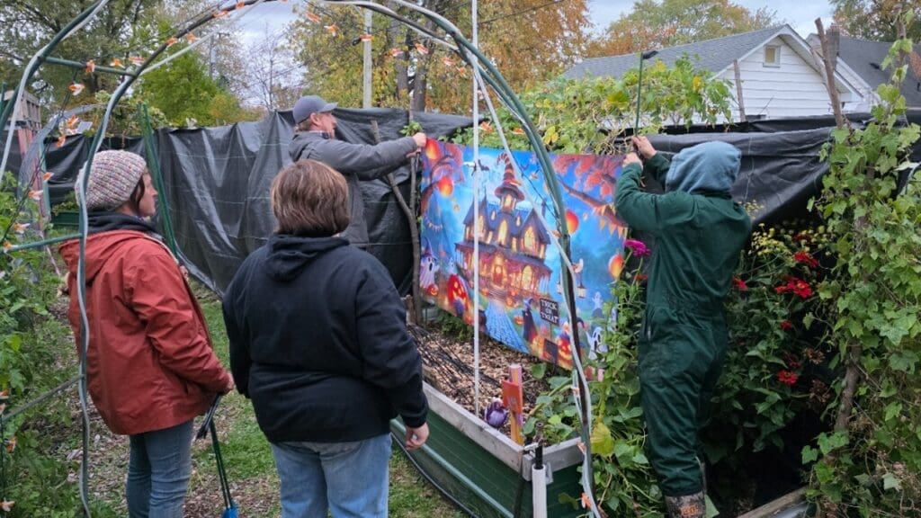 This kind of magic doesn’t happen overnight. A bunch of us spent Thursday, Friday, and all day Saturday transforming the garden into something extraordinary. And Saturday morning started with one of those perfect Michigan moments Bill captured: a line in the sky with blue to the south and clouds to the north. Then the clouds drifted away and gave us exactly what we needed – perfect planting weather for potatoes and garlic, followed by an ideal Halloween evening.