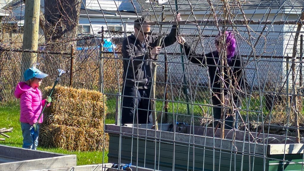 Becky and her family installing trellis at the Giving Garden